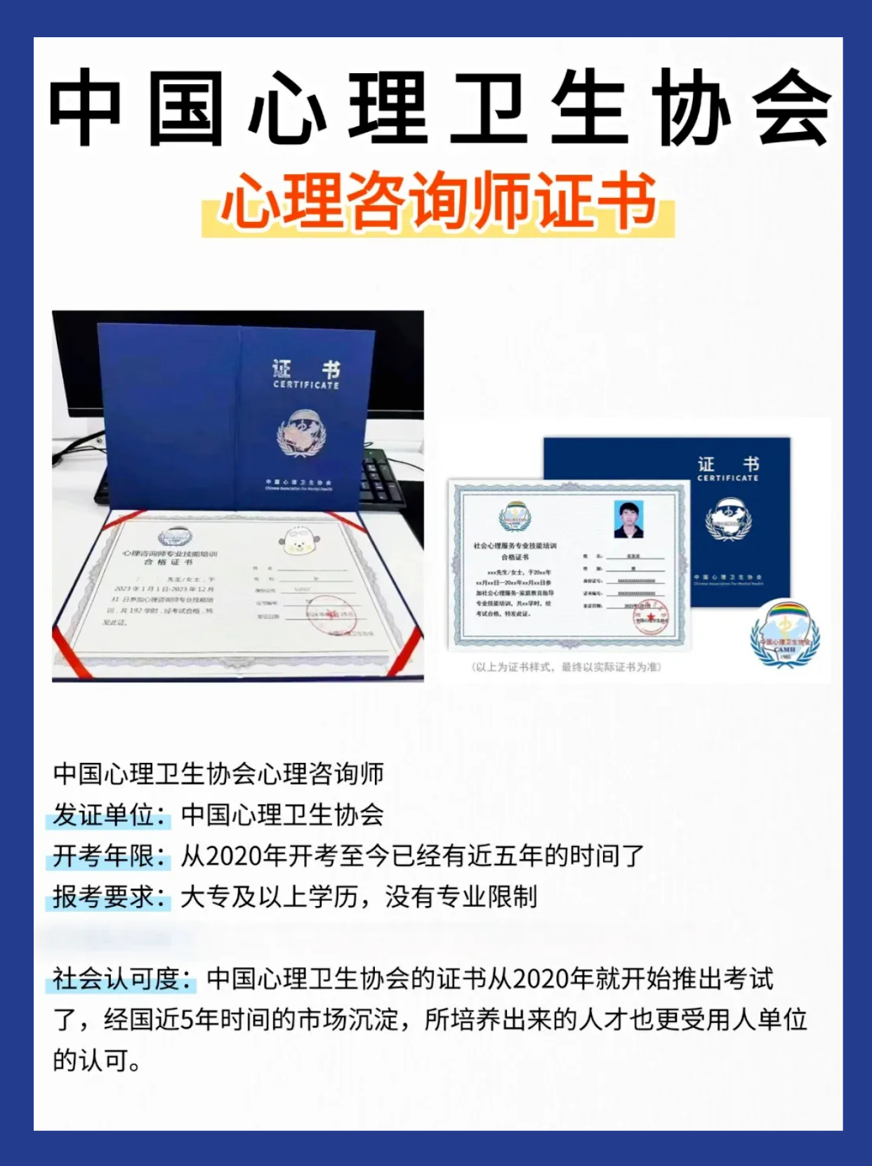 其中,中国心理卫生协会(简称 “中心协”)颁发的《心理咨询师专业技能培训证书》 认可度最高 —— 作为原人社部心理咨询师职业资格考试的技术支持单位,中心协主导过《心理咨询师国家职业标准》制定和官方教材编写,其证书含金量对标原国考标准,是非医疗领域(社区、学校、企业、心理咨询工作室等)入行的核心凭证,更是零基础小白的首选。
