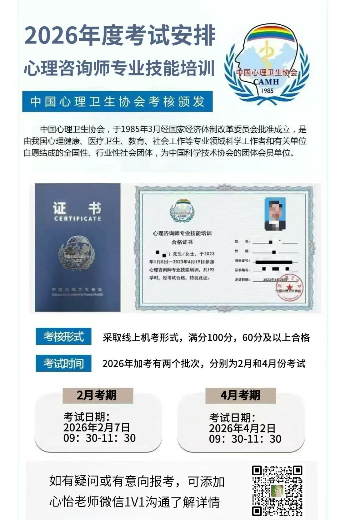 ● 考试时间:中国心理卫生协会心理咨询师证书正在改革期,还剩2月7日以及4月2日最后两次考试机会。