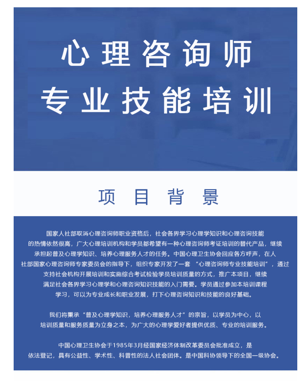 为此,中国心理卫生协会回应各方呼声,在人社部国家心理咨询师专家委员会的指导下,组织专家开发了一套 “心理咨询师专业技能培训”。