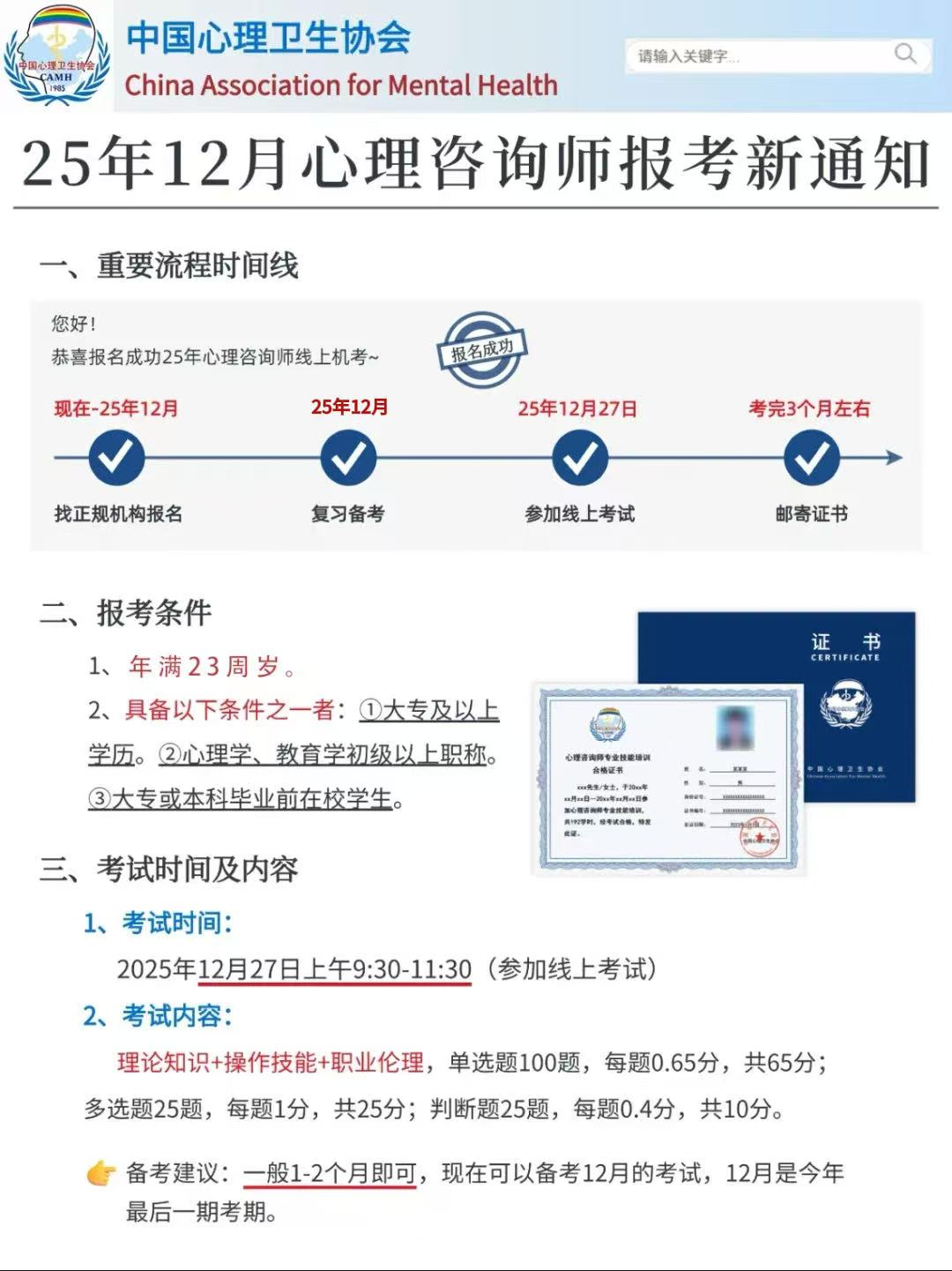 重要通知:根据最新安排,2025年12月27日将是中国心理卫生协会心理咨询师证书考核模式的最后一次考试机会,12月12日截止招生,逾期不再招收!