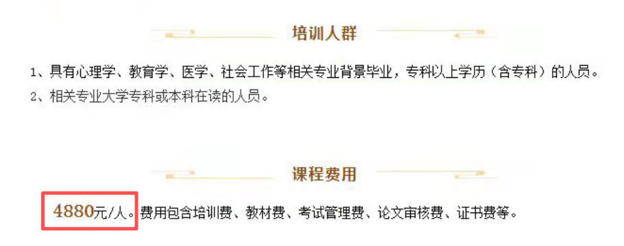 心理咨询师官网收费为4880元/人(费用包含培训课程费、考试管理费680元、证书制作费等。)