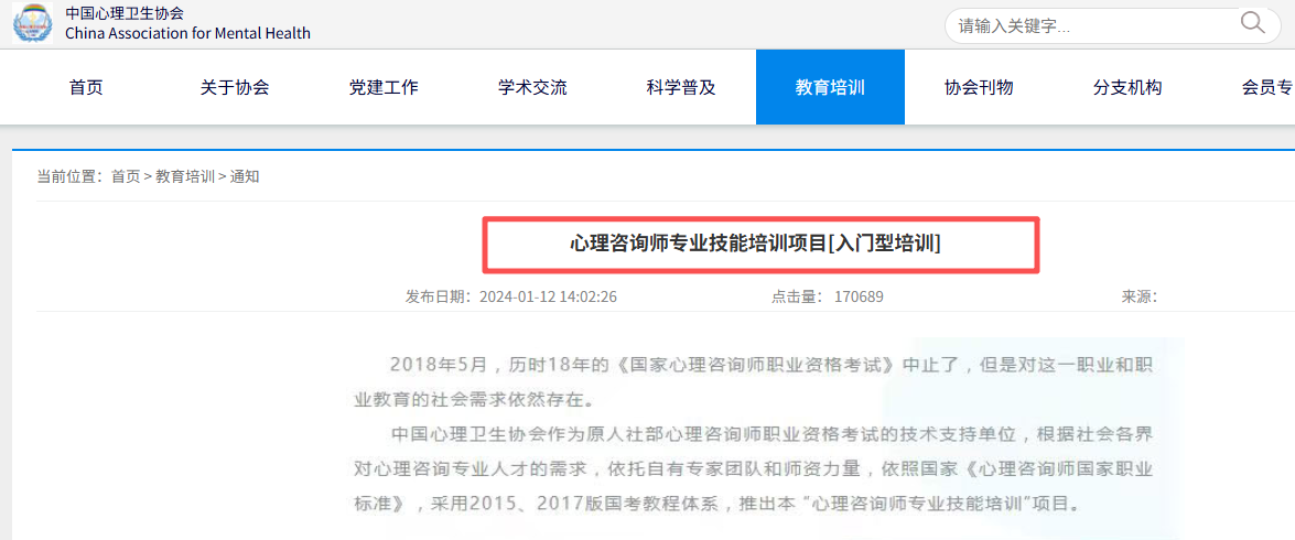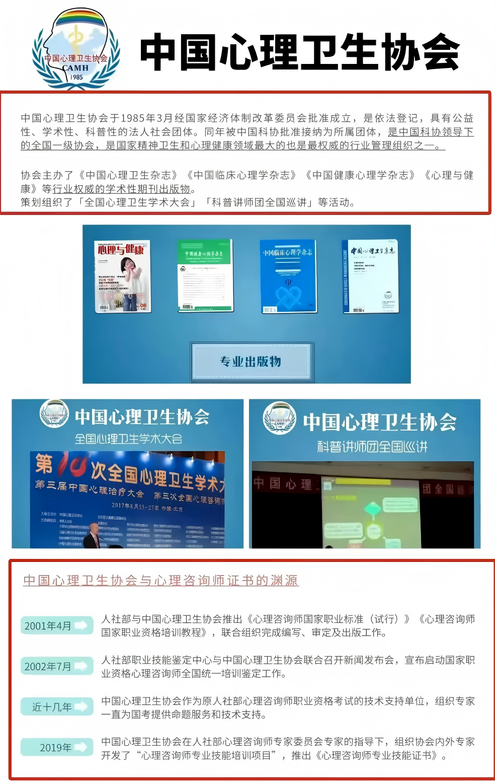 人社部心理咨询师资格证取消后,中国心理卫生协会作为原人社部心理咨询师资格考试的技术支持单位,发挥原有的工作经验和在心理学领域的专业优势,促进国内心理咨询师的专业成长和发展,推出了心理咨询师专业技能培训项目。