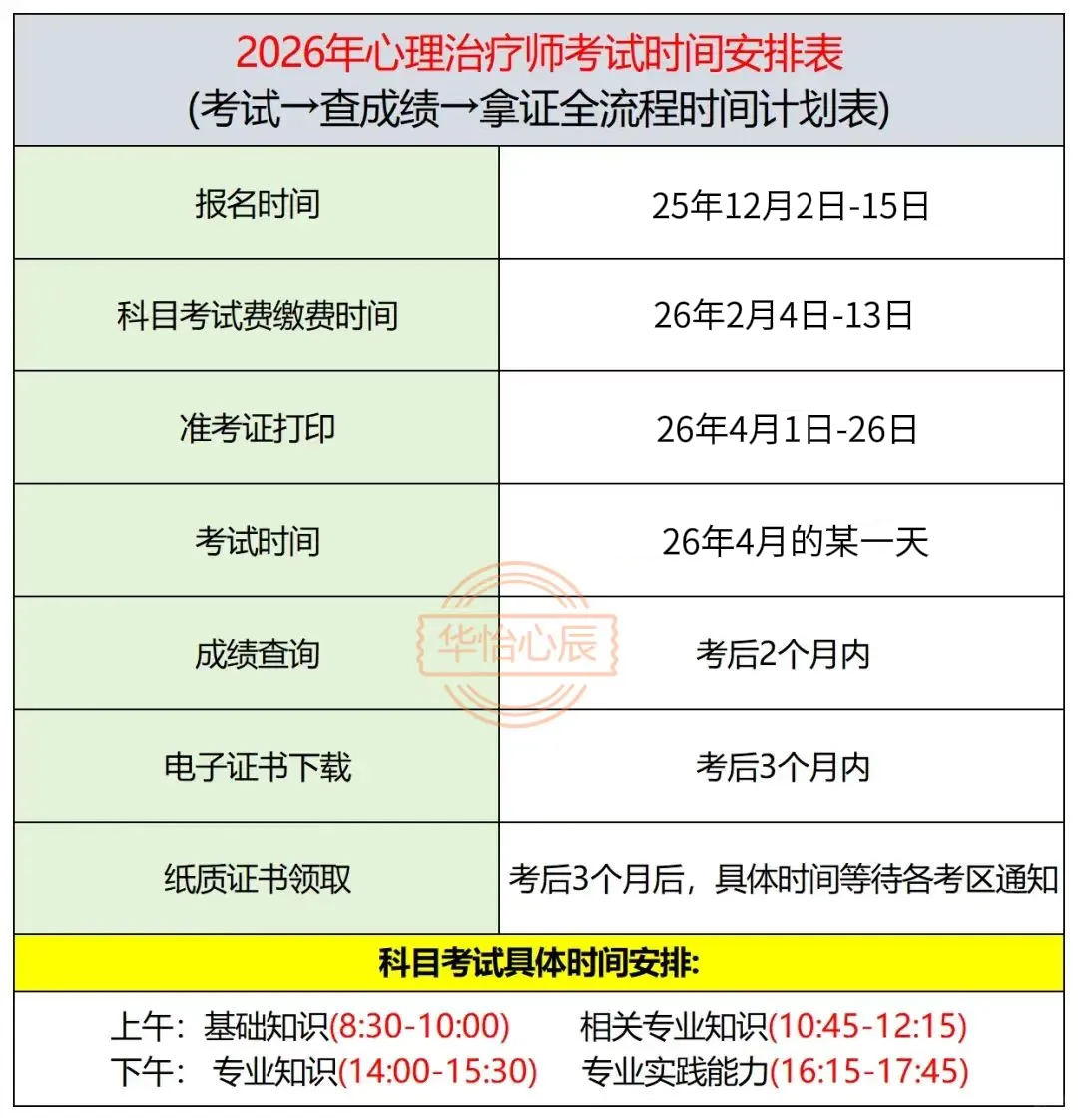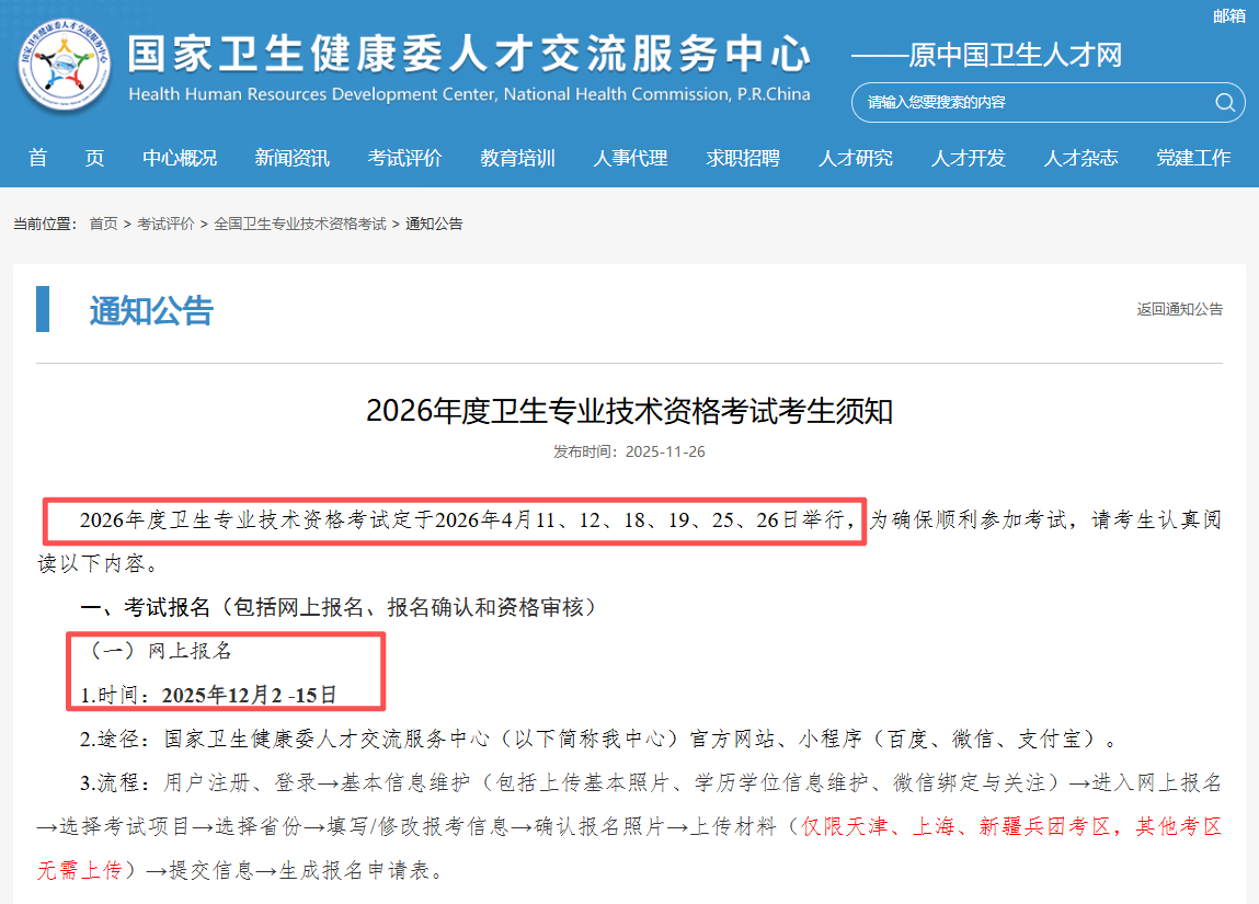 11月26日,国家卫生健康委人才交流服务中心正式发布通知,2026年度卫生专业技术资格考试(含心理治疗师)报名时间定于2025年12月2日-15日!