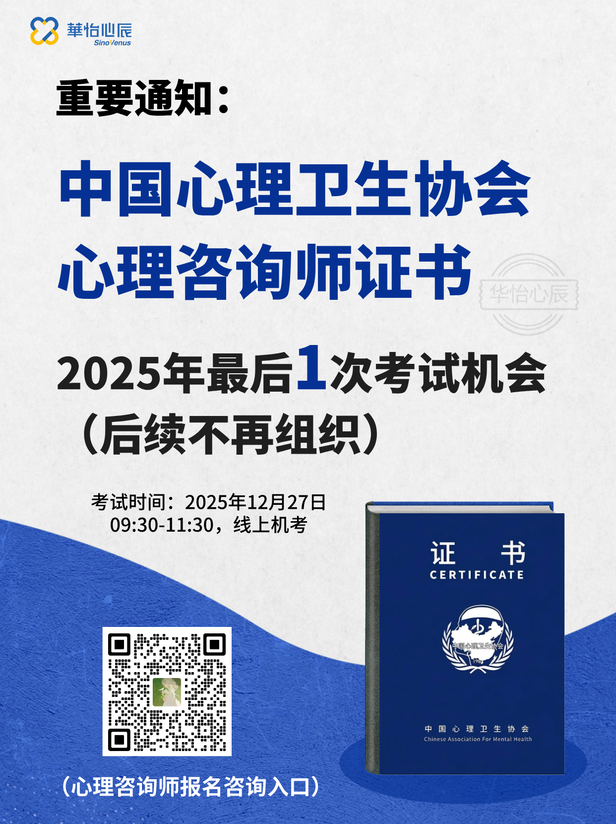 ●考试时间:根据最新安排,2025年12月27日将是中国心理卫生协会心理咨询师证书考核模式的最后一次考试机会,想要参加心理咨询师考试的朋友,可以抓紧时间联系心怡,获取1V1报考指导。