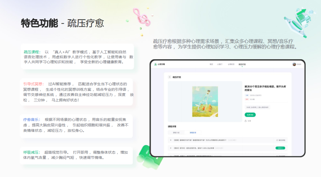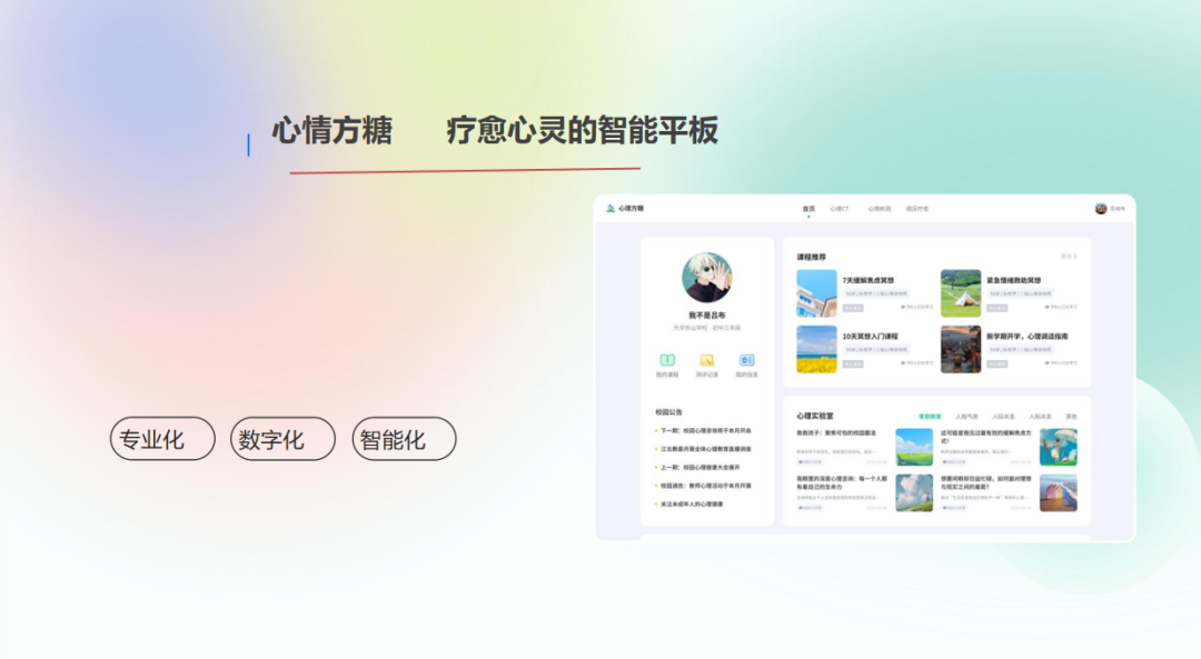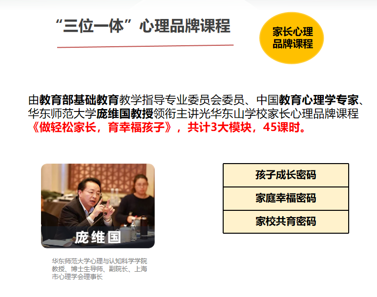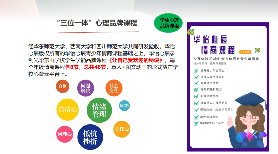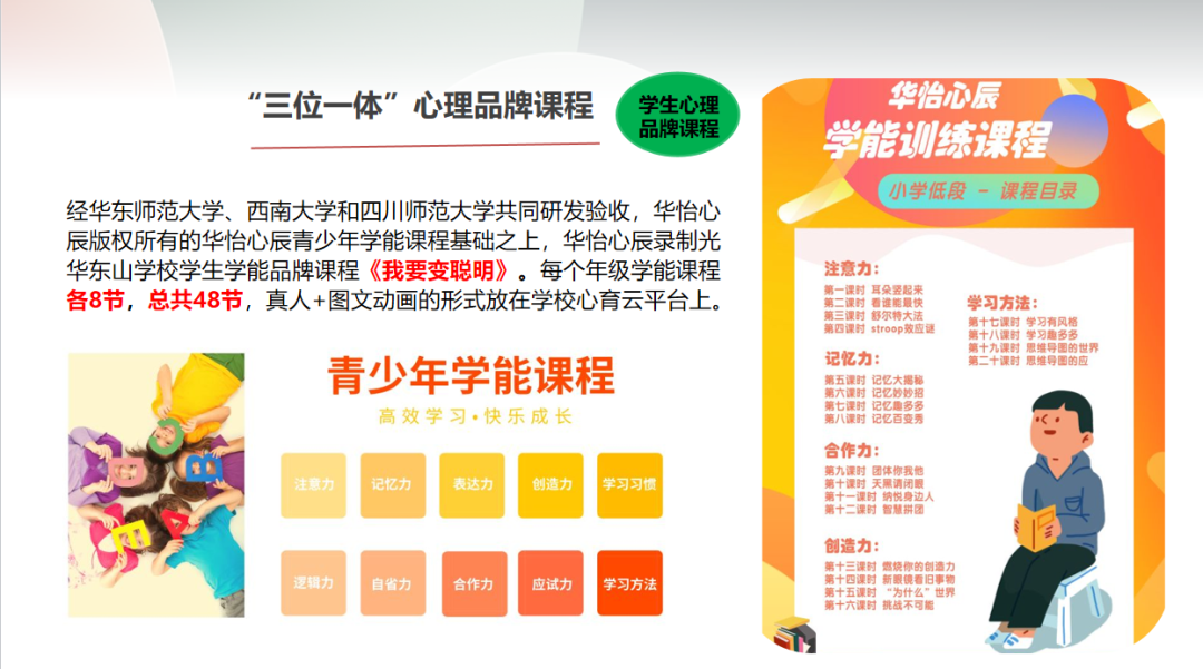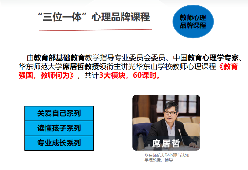 基于强大的系统,华怡心辰公司特邀华东师范大学心理专家为平台丰满内容,打造“三位一体”心理课程。