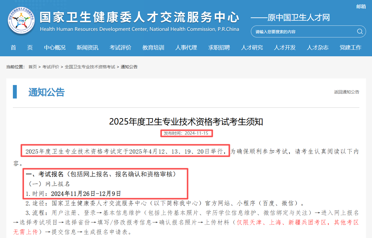 2024年11月15日,国家卫生健康委人才交流服务中心官网发布了关于《2025年度卫生专业技术资格考试考生须知》的通知公告。
